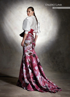 Spectacular haute couture dress that feigns two pieces, featuring a shirt-style bodice with a wide V-neckline and slightly draped. It is complemented with puffed sleeves, that add great elegance to the design. The waist is cinched, thanks to a mikado girdle with a small peplum, giving way to an original mermaid-cut skirt, made of spectacular brocaded organza.