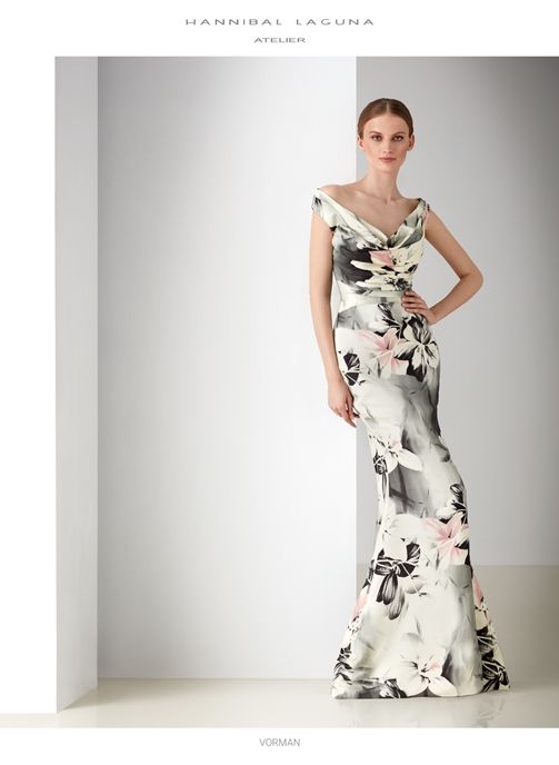 Long dress with mermaid cut with semi-bare shoulders and delicate oriental-inspired floral print. The combination of colors, the smooth tail and the volumes of the dress enhance the elegance and delicacy of the design.