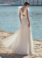This different and youthful wedding dress will win you over. It's made of georgette, a soft fabric that gently caresses the skin. Its evas‚ cut is the best option for this couture dress that defines the figure, highlighting its strong points. It features a sexy plunging neckline, with feather-embellished straps, that run down the draped bodice to an open back. The waist is cinched with a draped sash, from which flows light, pleated soleil skirt, perfect for any celebration.