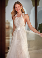 You will fall in love with this A-line suit, made of tulle and lace. A dress, that is full of movement. Its halter neckline, draped in tulle, reveals clean shoulders and is romantically complemented by floral crystal decorations, that finish the neckline and waist. This style shows off an open back, giving way to a fluid skirt of gathered tulle, that powders a lace underskirt, ending in a large train. It is perfect for any ceremony.